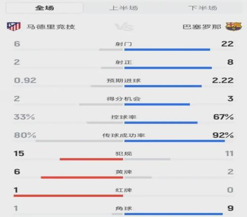 全场比赛数据:射门22-6、射正8-2、控球率67%-33%、角球9-1。巴萨用一场压倒性的场面数据,兑现了弗里克赛前“客场也要掌控比赛”的承诺。